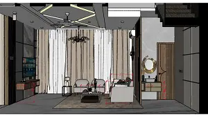 Image of the living room highlighting a spacious dining area with a contemporary dining table, chairs, and an elegant chandelier against a decorated wall 2d dimensions