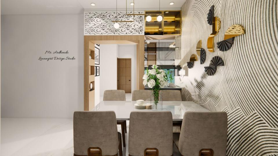 Image of the living room highlighting a spacious dining area with a contemporary dining table, chairs, and an elegant chandelier against a decorated wall