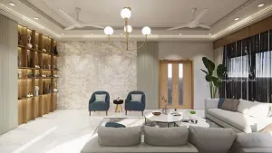 Image of the living room highlighting a spacious dining area with a contemporary dining table, chairs, and an elegant chandelier against a decorated wall 2d dimensions