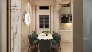Image of the living room highlighting a spacious dining area with a contemporary dining table, chairs, and an elegant chandelier against a decorated wall