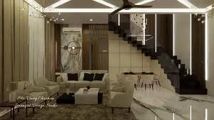 Image of the living room highlighting a spacious dining area with a contemporary dining table, chairs, and an elegant chandelier against a decorated wall 2d dimensions