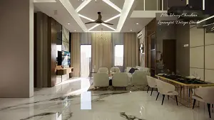 Image of the living room highlighting a spacious dining area with a contemporary dining table, chairs, and an elegant chandelier against a decorated wall