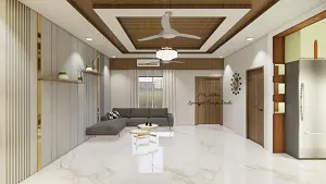Image of the living room showcasing a comfortable seating area with a large sofa, coffee table and neutral-toned wall