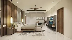 Image of the master bedroom featuring a luxurious bed with a tufted headboard, bedside tables, and pendant lights against an accent wall 2d dimensions
