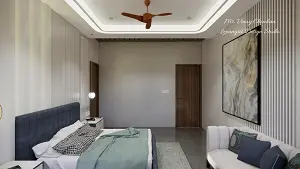master bedroom false ceiling separated in two parts one is the passage made of wooden PVC panel another is the above the bed made of 2 gypsum trey and strip light glowing from inside the treys, and a fan in the center