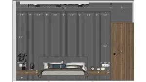 Image of the master bedroom featuring a luxurious bed with a tufted headboard, bedside tables, and pendant lights against an accent wall 2d view