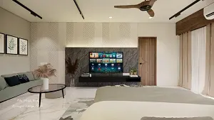 Image of the master bedroom room featuring a modern entertainment center with a flat-screen TV and built-in against a sleek accent wall