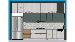 Image of the modular kitchen displaying a functional cooking area with a gas stove, oven, and a range hood against a tiled wall 2d dimensions