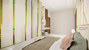 Image of the parents bedroom showing luxurious bed,stylish dresser with round shape mirror and spacious wardrobe