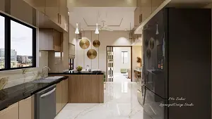 In this image we can see a kitchen counter & breakfast counter , SS steel basin ,dish washer,we've placed hanging lights above the breakfast counter for aesthetic purpose,Beige coloured Acrylic finish is used for kitchen storage and wooden laminate finish for breakfast counter .