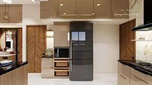 In this image we can see a tall pantry unit beside Refrigerator consists of wicker baskets, owen and stoage for remaining appliances,for loft sorage beige acrylic finish is given and as well as for botton units,brass linear handles used for loft storage,flooring we've given white italian marble texture finish with glossy look.