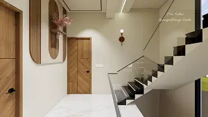 In this image we can see a wall design is given for lobby wall with a wooden laminate finish and a artificial plant placeed above it, wall light is placed at stairs wall & doors are designed with wooden laminate finish with Zig-Zag pattern ,black marble texture is used for stairs flooring and toughened glass railing is given.