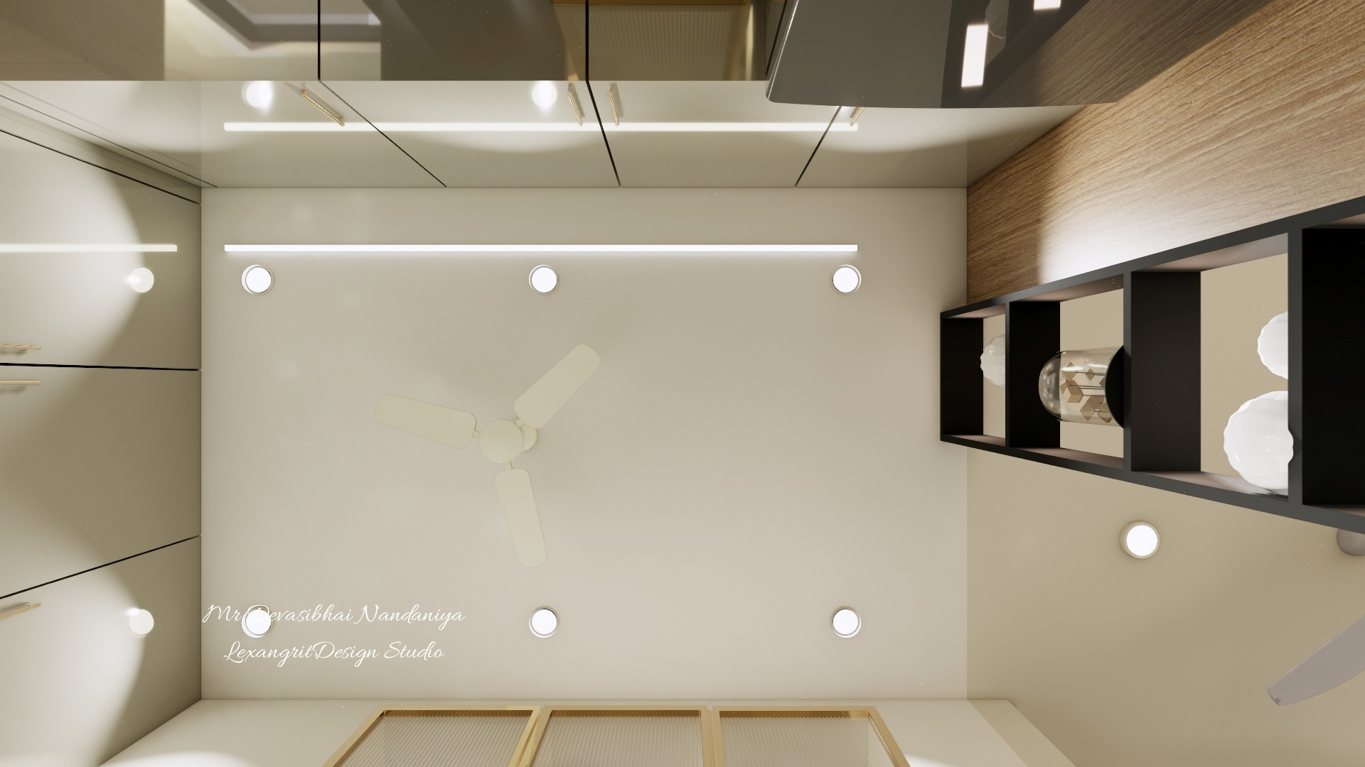 Ceiling is a combination of pvc panels & see through hallow linear lines which is designed with black finish and a fan is placed ,spotlights are given accordingly