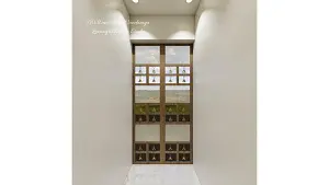 In this image we can see pooja door which is designed with teak beading wooden finish with the combination of fluted glass and bells for traditional look.
