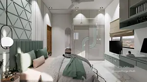 In this image we can see sliding wardrobe with ash grey glossy laminate finish with semi curve groove design with blue texture inside,we've given dressing unit beside mirror & tv cum study unit opposite bed,with suitable drawers & a brass linear handles,for study unit upper storage & loft is designed with open storage racks between them,black & white textured fabric carpet is given under the bed