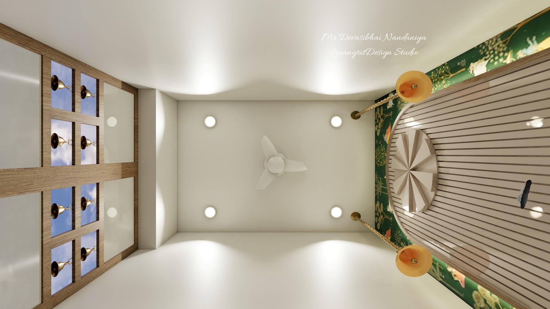 we can see the ceiling view in this image, where we've designed round ceiling offsets accordingly ,at centre a chandeliar has been given for a grand look.