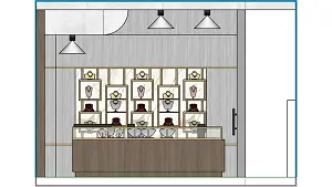 Jewellery shop showcase for jewellery design with golden ss rode, fluted wall panel 2d dimentions
