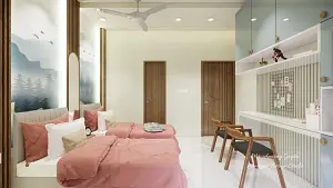 Kids bed room entrance view with two bed & highlights head board wall  2d dimensions