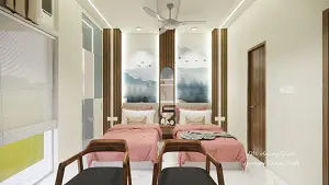 Kids bed room entrance view with two bed & highlights head board wall