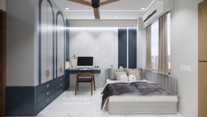 A kids' bedroom where the bed back works overtime — homework station on one side, wardrobe on the other, and dreams in the middle.