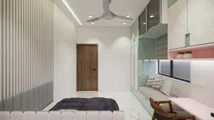 Kids bedroom featuring a mint laminated wardrobe with bay window and study table, baby pink wall cabinet, small bed with sober wallpaper, and white louvers kids bed back design; stylish kids room bed back wall design and bed back design for kids room.