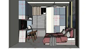 Kid's room showcasing two bed & study table ,book storage & wardrobe 2d dimensions