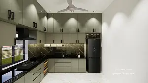 A modern kitchen view showcasing sage green laminated storage units with sleek black profile handles, integrated under-cabinet lighting, a black refrigerator, and a built-in stovetop beside a large window, all set on white Italian marble flooring.
