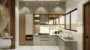 Kitchen with wiker busket, bottle pull out, 3 drawer unit andtall unit, golden framed wall caminates and lofts