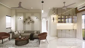 Living area showcasing seating area front of decorative center table,sofa back side decorative wall and crockery unit