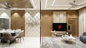 A spacious combined living and dining design in an open-plan layout featuring a TV unit wall with main door and dining table that seamlessly connect the two spaces.