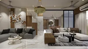 Living room and drawing room back wall design with mini militia sofa wallet PVC Marvel laminate and WPC fluted louvers