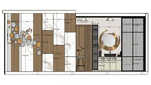 Living room and drawing room back wall design with mini militia sofa wallet PVC Marvel laminate and WPC fluted louvers working drawing 2D