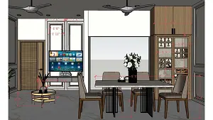 Living room another view large sofa set and dining table ,puja room and kitchen breakfast unit area 2d dimensions