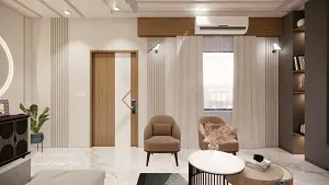 A view of the living room’s window wall featuring floor-to-ceiling curtains, a light wood textured door with a vertical white stripe, decorative wall grooves, and a shelving TV unit with warm integrated lighting, all set on Italian white marble flooring.