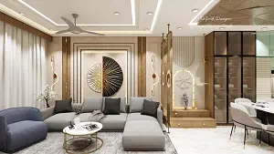 Elegant open-plan living cum dining room divided by a stunning designer glass partition with golden metal accents.