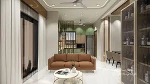 Living room showcasing a comfortable seating area with a small sofa, coffee table, and a stylish gold metallic partition against a neutral-toned wall
