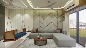Living room showcasing decorative wall design and large sofa seating area front of center table and jhula 2d dimensions