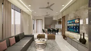 Living room showcasing sleek tv unit and decorative wall, seating area front of center table