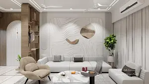 Living room sofa back design with wave board hdhmr CNC cut design with photo frames,5 seater sofa with lounge chair and round table.