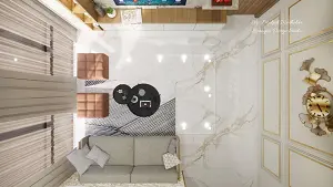 Detailed TV elevation photo showcasing a living room TV unit 2D layout with UV marble sheet paneling, golden strip accents, ivory laminate base, and vertical shelving for precise interior execution.