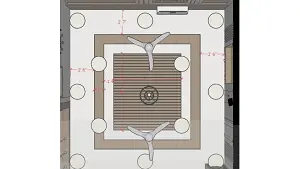 2D elevation working drawing of the living room wooden false ceiling with two fans — showing exact dimensions and fan positions for precise on-site execution.