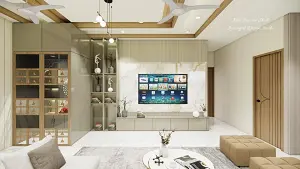Living showcasing puja unit & open shelf storage,tv unit some storage with louvers panelling, marble sheet design