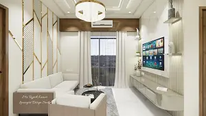 Elegant sofa back wall design showcasing interior sofa back wall design with HDHMR CNC-cut panel, duco finish, and golden strips — a refined sofa back wall and drawing room back wall design complemented by a 1+2 sofa set, coffee table, full-height curtains with pelmet, and dining and kitchen views for a cohesive living room sofa back side wall design layout.