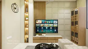 Living tv unit view ,open shelf storage & back wall louvers panelling design