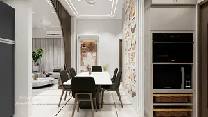 A thoughtfully planned dining area with a six-seater dining table at the center, highlighted by a half-arch TV unit cum separator between the living and dining zones, complemented by a rafter-style kitchen on the left and a pooja unit on the right for a balanced interior layout.