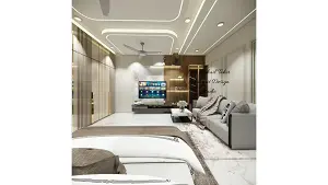 Luxurious master bedroom tv unit view & 4 seater luxurious lofa front of center table zoom out view