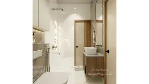 A second angle of the same luxury bathroom — showing the wall-mounted WC against grey textured tiles, a rain shower with recessed niche shelving, white marble walls, and a wooden floating vanity with vessel sink and full-height mirror — a complete modern bathroom design where every corner is considered.