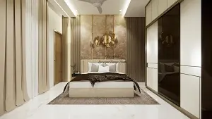 Luxury bedroom bed back wall design with wooden rafters, leather finish laminate and golden T profile strip panelling