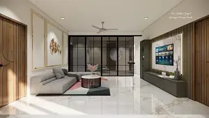Luxury seatinag area front of sleek tv unit and decorative wall design