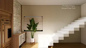 A decorative false ceiling with profile lighting above the staircase — a design detail that transforms a transitional space into a visually striking feature of the Jamnagar villa.